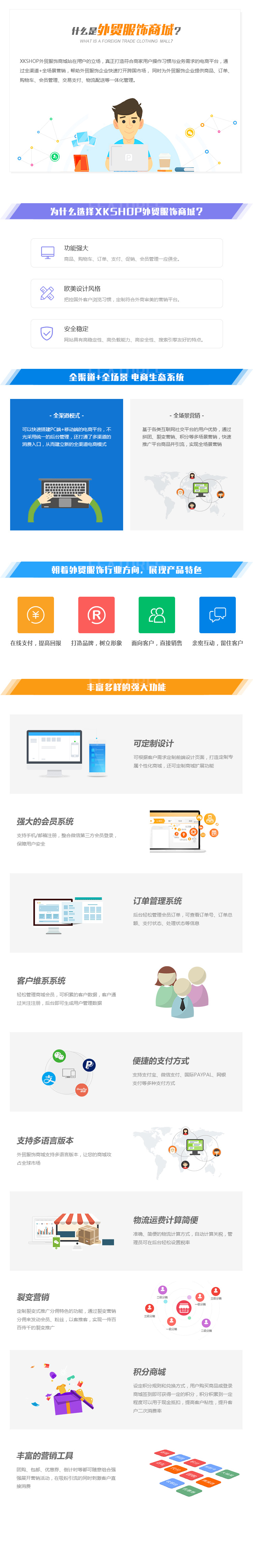 XKSHOP外貿(mào)服飾商城站在用戶的立場,真正打造符合商家用戶操作習(xí)慣與業(yè)務(wù)需求的電商平臺,通過全渠道+全場景營銷,幫助外貿(mào)服飾企業(yè)快速打開跨國市場, 同時(shí)為外貿(mào)服飾企業(yè)提供商品、訂單、購物車、會員管理、交易支付、物流配送等一體化管理。