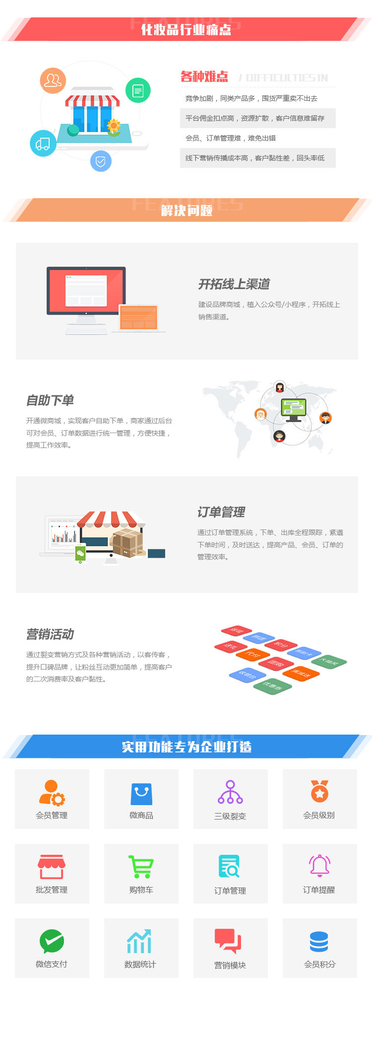 開通微商城,實現客戶自助下單,商家通過后臺可對會員、訂單數據進行統一管理,方便快捷,提高工作效率。