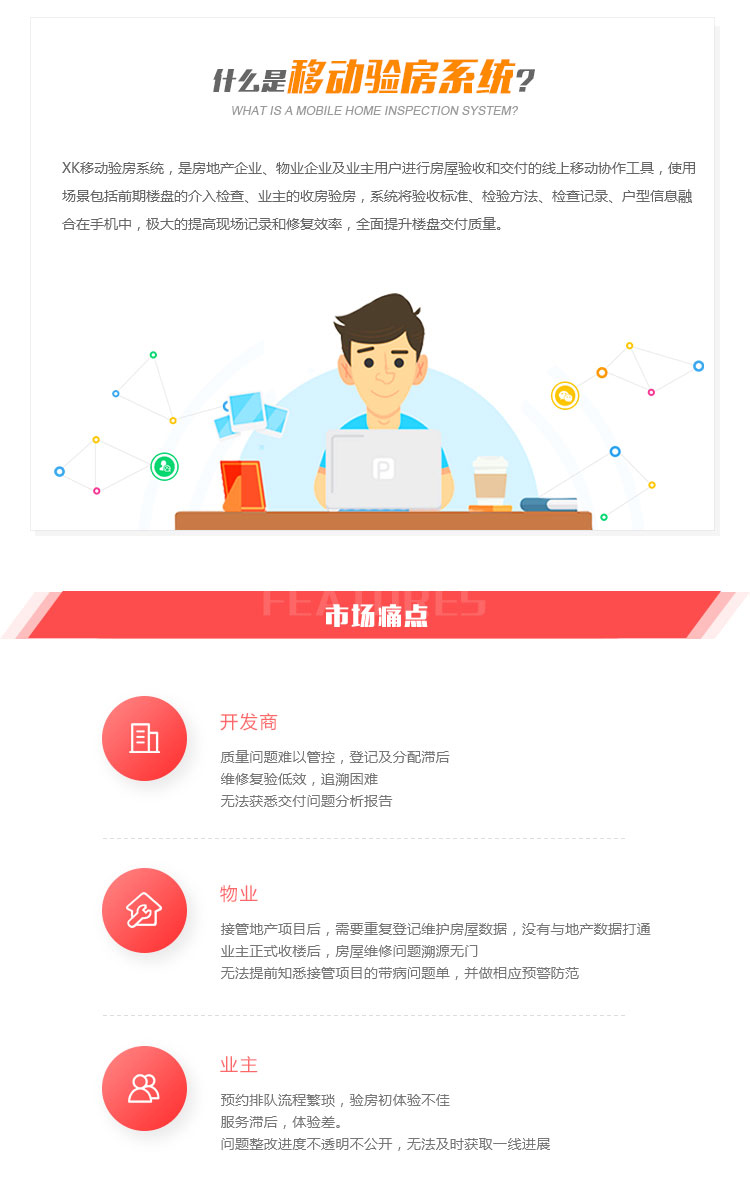 1、XK移動驗房系統,是房地產企業、物業企業及業主用戶進行房屋驗收和交付的線上移動協作工具,使用場景包括前期樓盤的介入檢查,業主的收房驗房,系統將驗收標準,檢驗方法,檢查記錄、戶型信息融合在手機中,極大的提高現場記錄和修復效率,全面提升樓盤交付質量。
