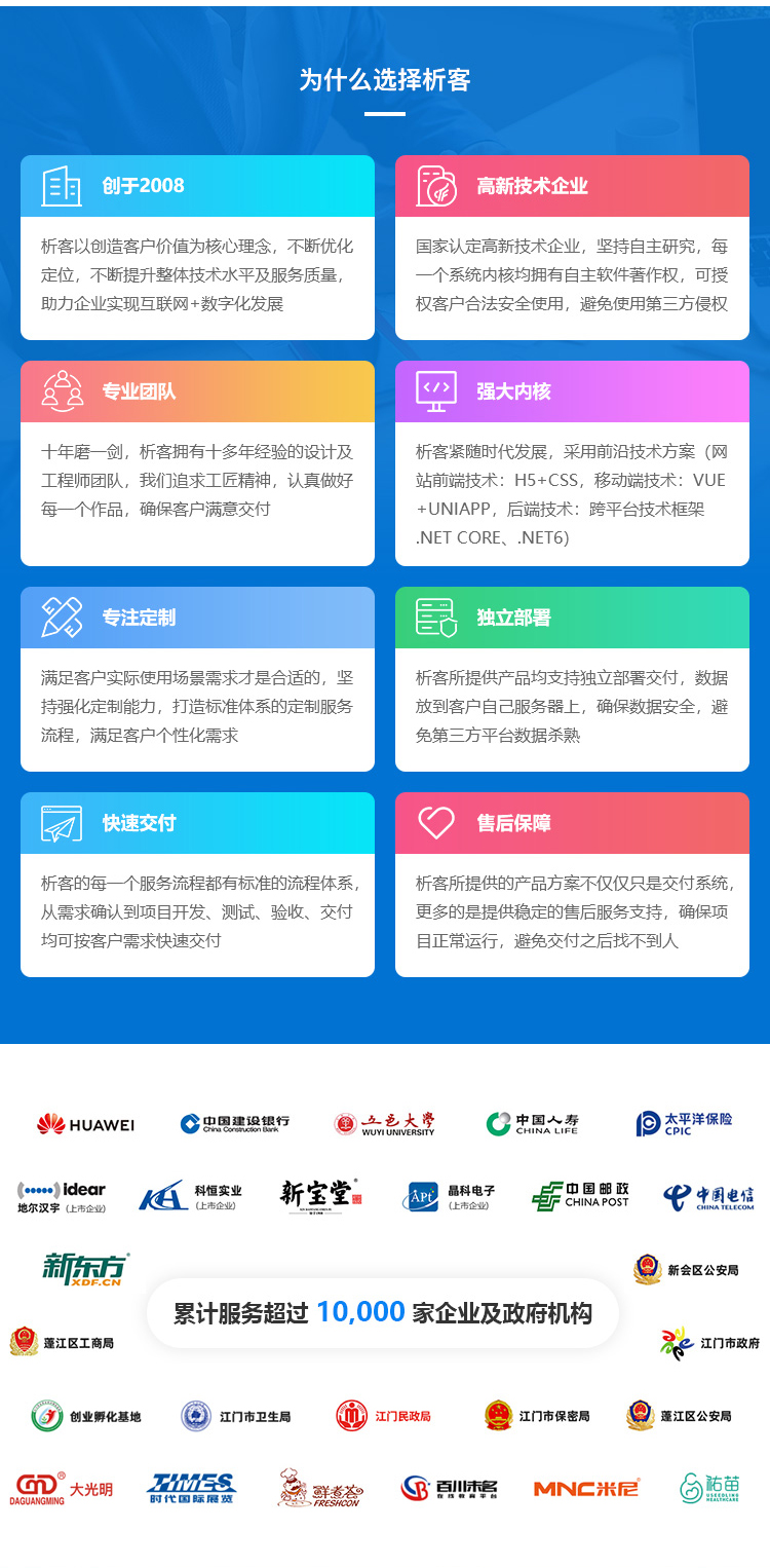 析客網絡科技有限公司創立于2008年,是一家信息化高新技術企業,專注解決各類信息化定制需求;旗下自主研發產品包含XKOA(移動辦公)、XKSHOP(云商城)、XKCMS(云官網)、XKGOV(云政務)、XK+(行業解決方案)、旺鋪貓SAAS商城, 均可結合客戶實際需求進行定制開發,已為上萬家企事業單位提供信息化技術服務。