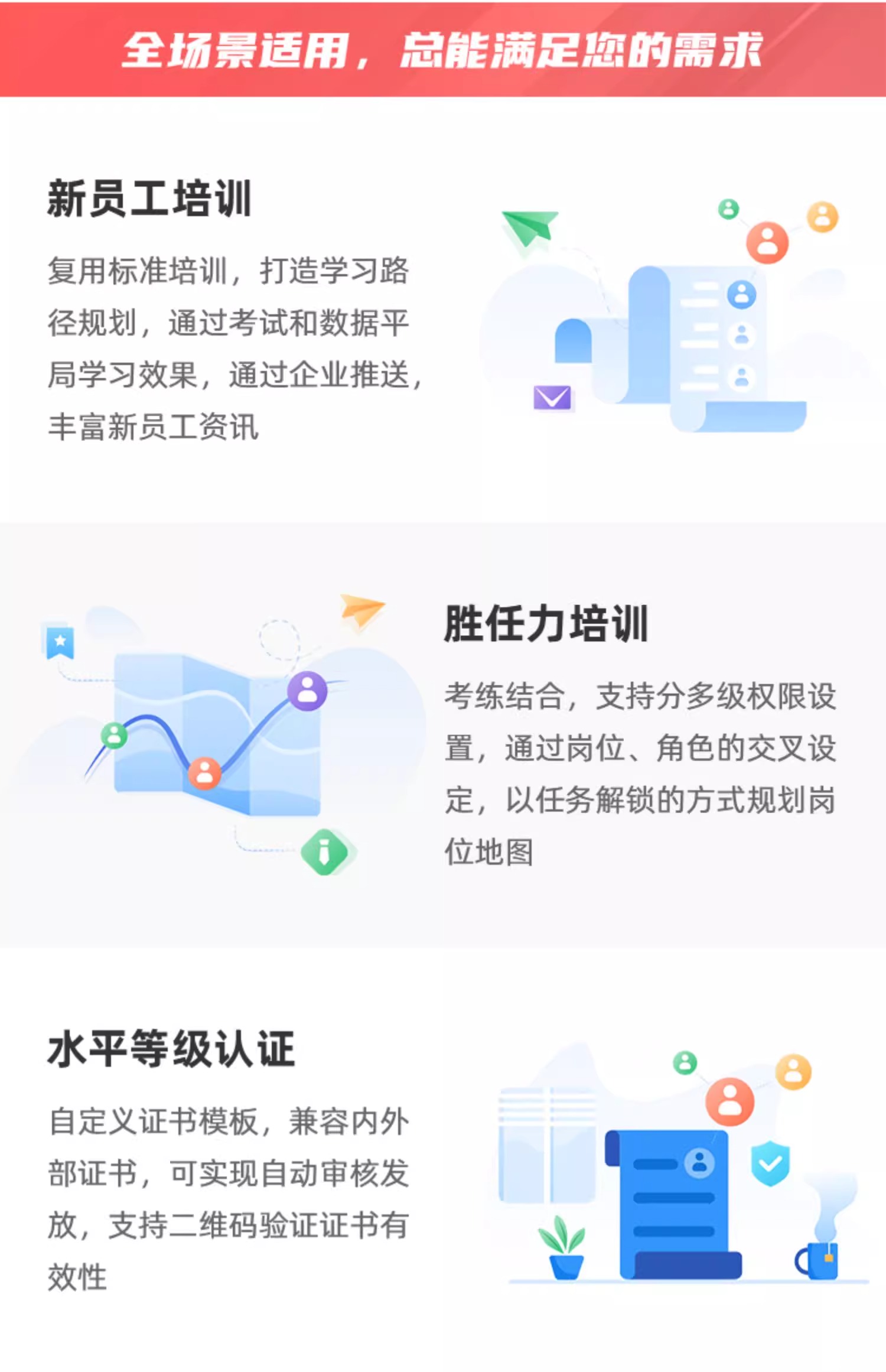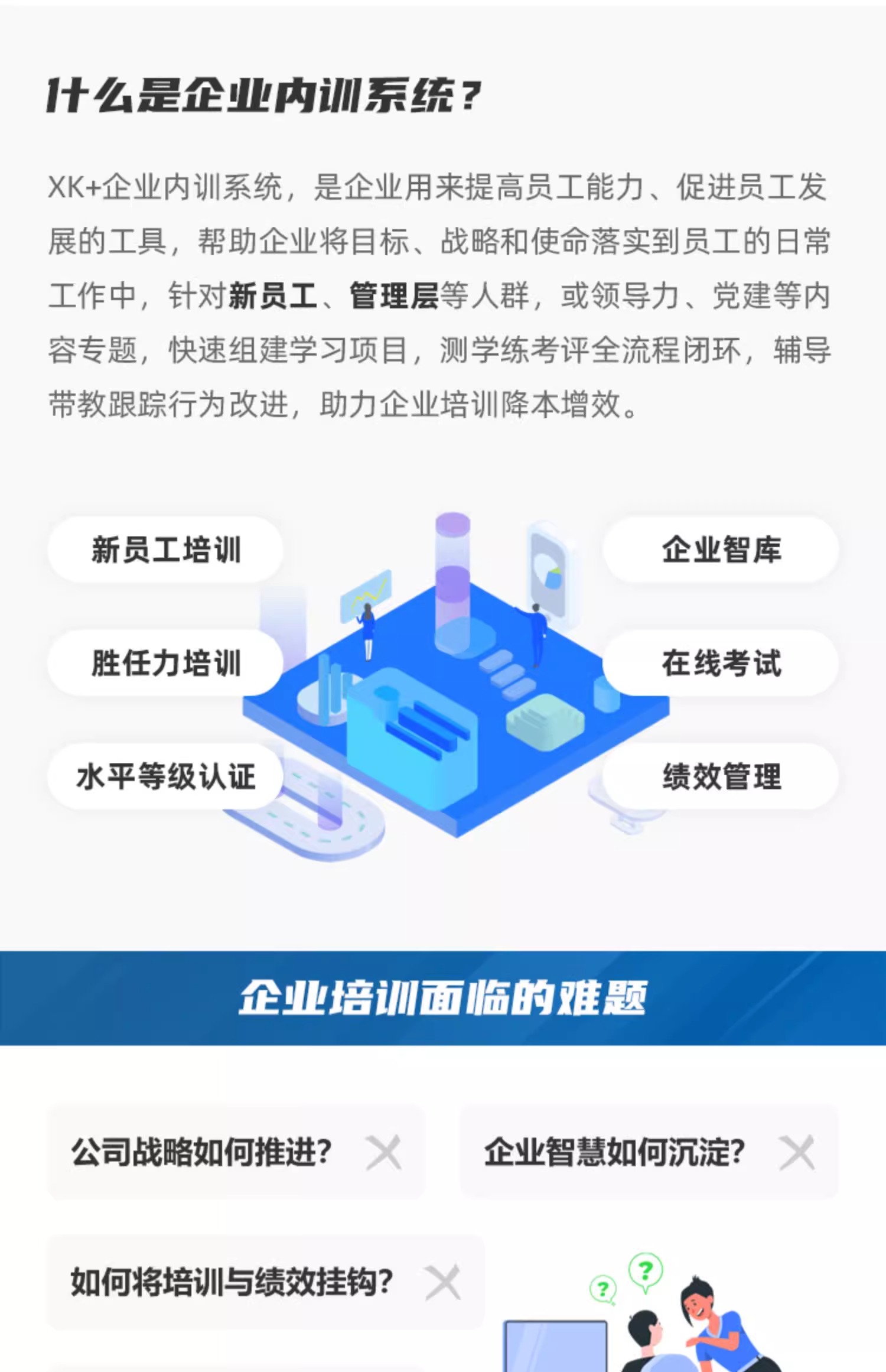 XK+企業內訓系統,是企業用來提高員工能力、促進員工發展的工具,幫助企業將目標、戰略和使命落實到員工的日常工作中,針對新員工、管理層等人群,或領導力、黨建等內容專題,快速組建學習項目,測學練考評全流程閉環,輔導帶教跟蹤行為改進,助力企業培訓降本增效。