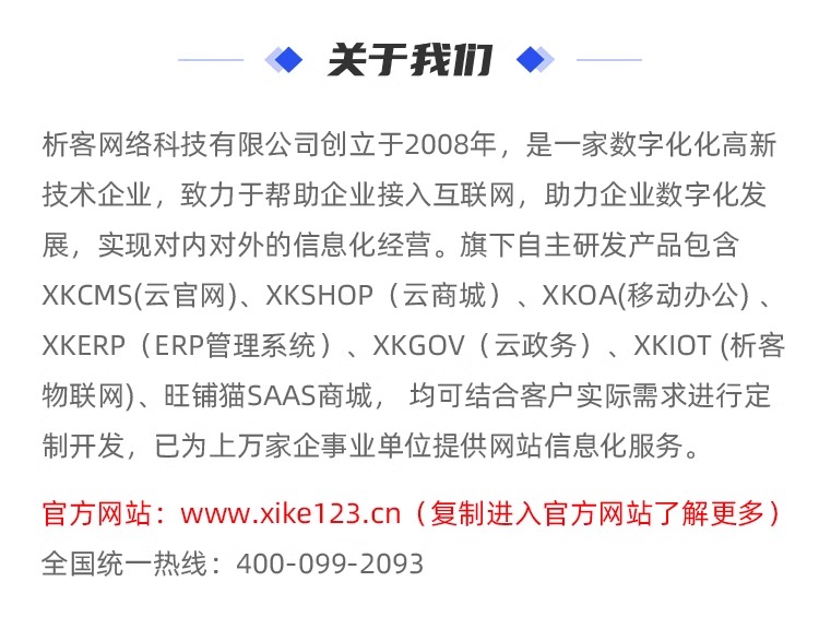 析客網(wǎng)絡(luò)科技有限公司創(chuàng)立于2008年,是一家數(shù)字化化高新技術(shù)企業(yè),致力于幫助企業(yè)接入互聯(lián)網(wǎng),助力企業(yè)數(shù)字化發(fā)展,實(shí)現(xiàn)對(duì)內(nèi)對(duì)外的信息化經(jīng)營(yíng)。旗下自主研發(fā)產(chǎn)品包含XKCMS(云官網(wǎng))、XKSHOP(云商城)、XKOA(移動(dòng)辦公) 、XKERP(ERP管理系統(tǒng))、XKGOV(云政務(wù))、XKIOT (析客物聯(lián)網(wǎng))、旺鋪貓SAAS商城, 均可結(jié)合客戶實(shí)際需求進(jìn)行定制開發(fā),已為上萬(wàn)家企事業(yè)單位提供網(wǎng)站信息化服務(wù)。