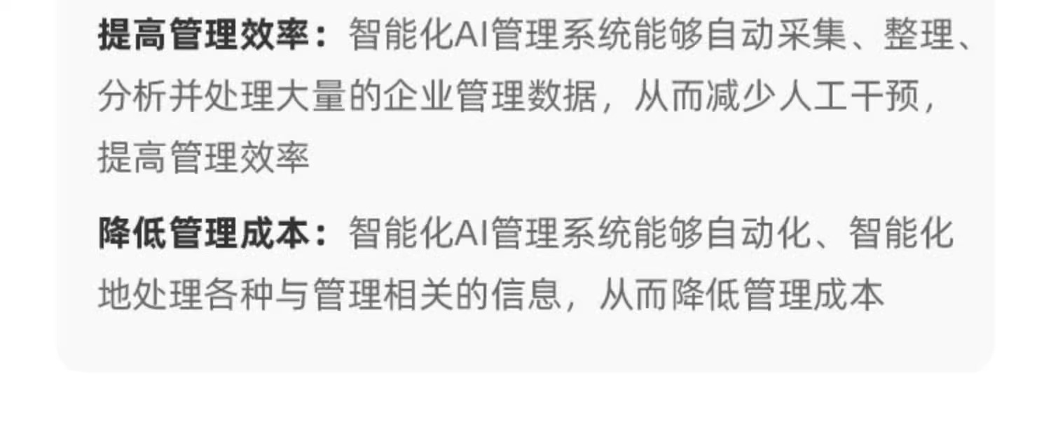 降低管理成本:智能化AI管理系統(tǒng)能夠自動(dòng)化、智能化地處理各種與管理相關(guān)的信息,從而降低管理成本