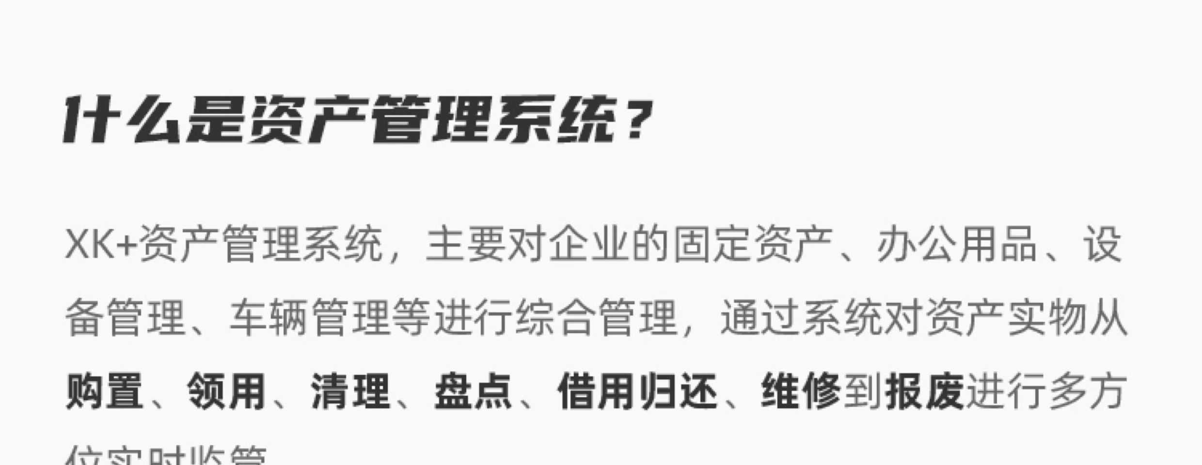 XK+資產管理系統,主要對企業的固定資產、辦公用品、設備管理、車輛管理等進行綜合管理,通過系統對資產實物從購置、領用、清理、盤點、借用歸還、維修到報廢進行多方位實時監管。