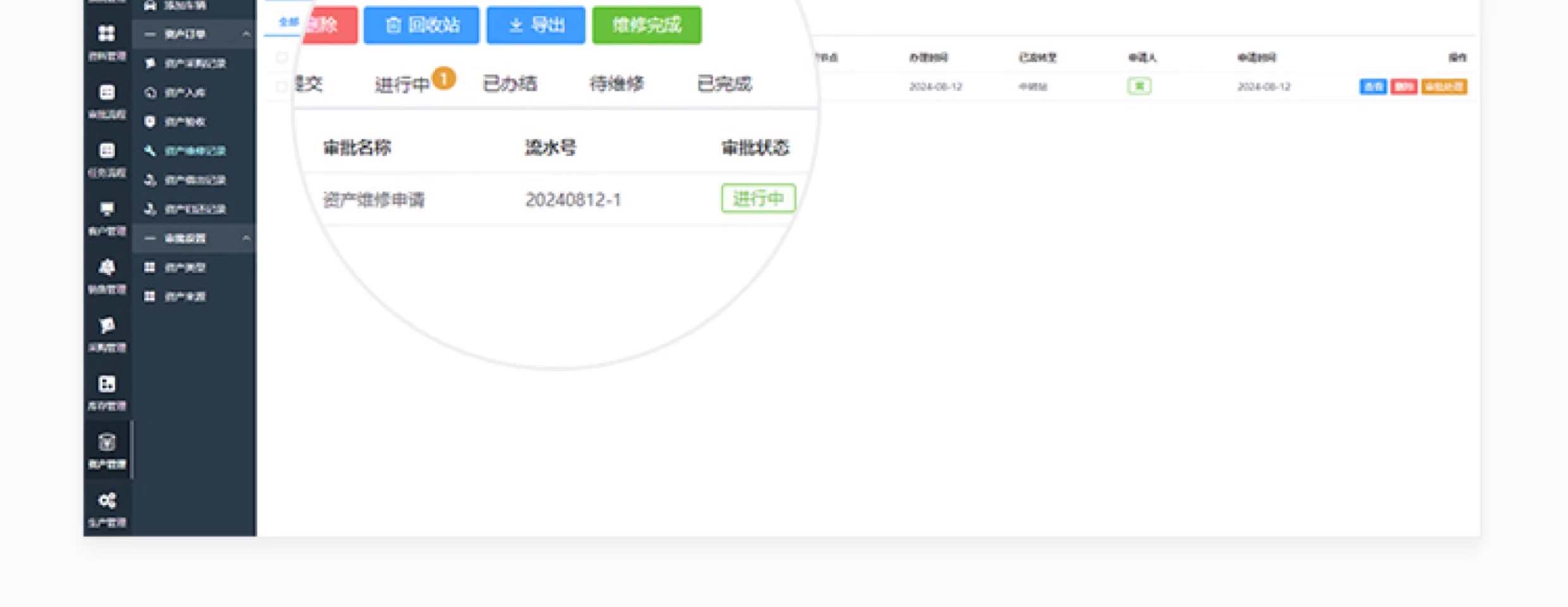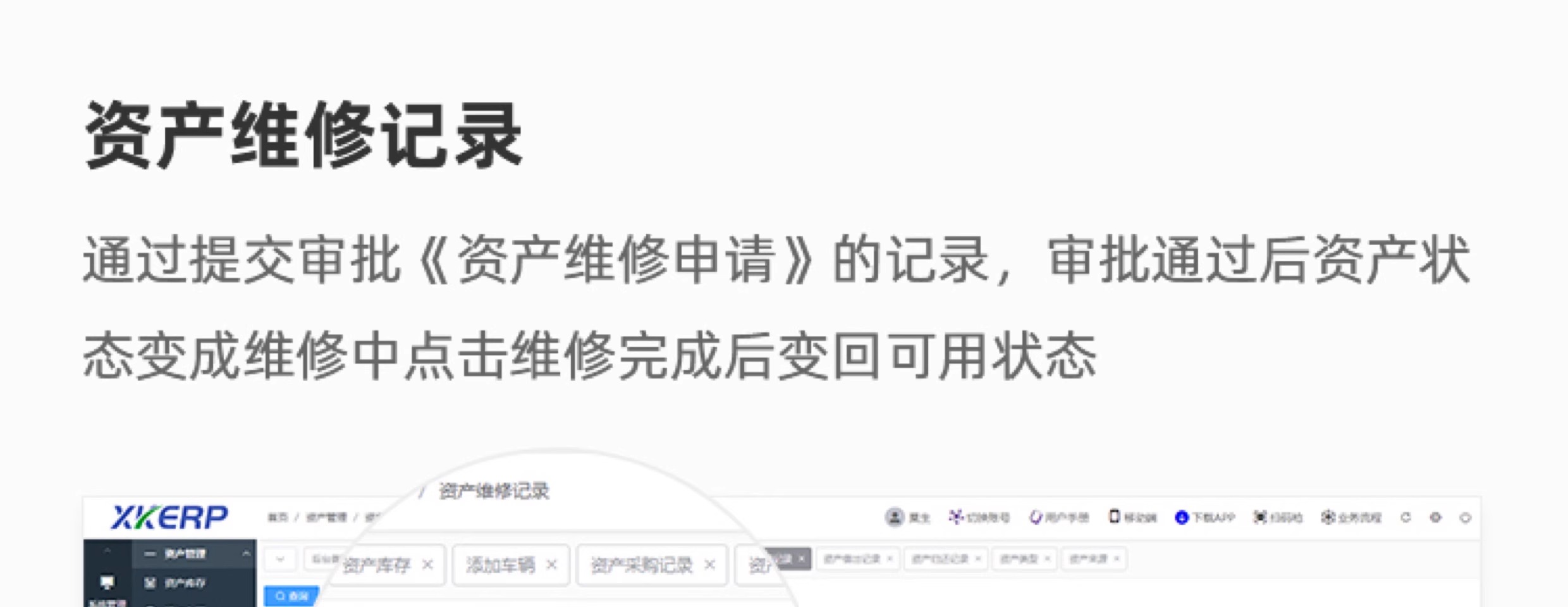 資產維修記錄:通過提交審批《資產維修申請》的記錄,審批通過后資產狀態變成維修中點擊維修完成后變回可用狀態