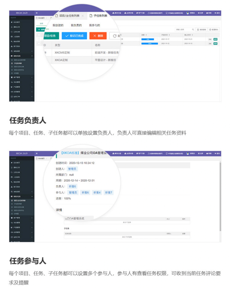 XKOA-項(xiàng)目/任務(wù)系統(tǒng),可視化地呈現(xiàn)項(xiàng)目/任務(wù)的詳情、任務(wù)安排、討論情況、問題、文檔,分工明確地指派負(fù)責(zé)人,清晰地把控項(xiàng)目/任務(wù)整體健康狀況,迅速提升團(tuán)隊(duì)"執(zhí)行力"。具體功能如下: