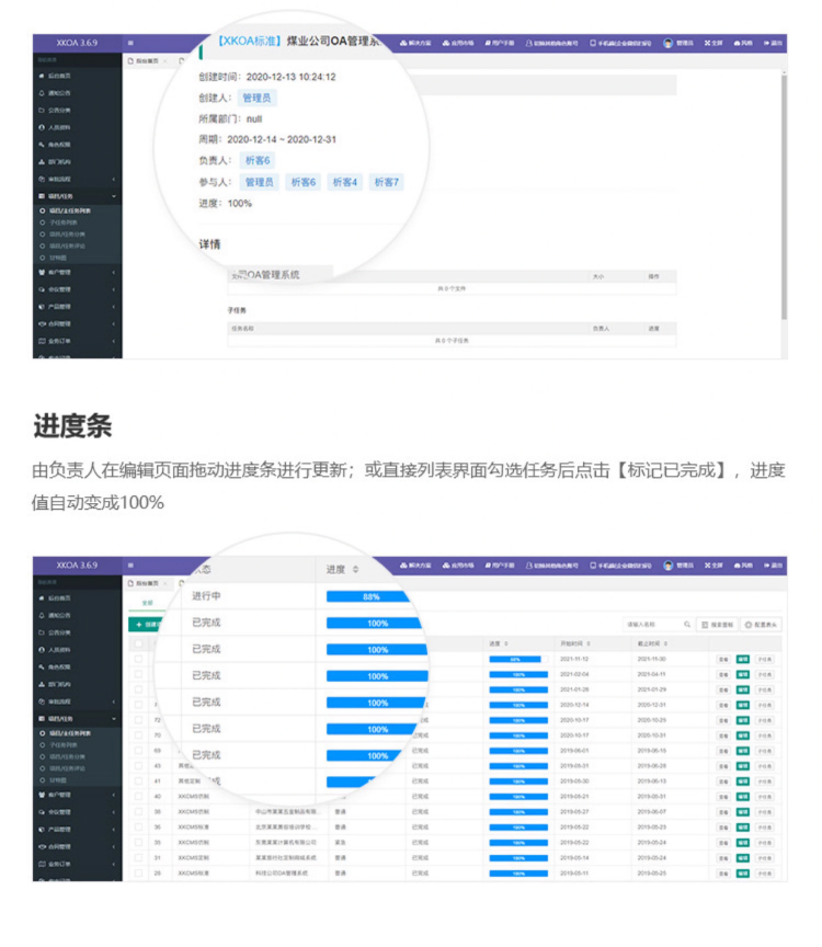 5、進(jìn)度條:由負(fù)責(zé)人在編輯頁面拖動(dòng)進(jìn)度條進(jìn)行更新;或直接列表界面勾選任務(wù)后點(diǎn)擊【標(biāo)記已完成】,進(jìn)度值自動(dòng)變成100%;